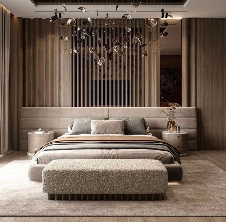 Panels behind the headboard make an elegant backdrop. They also absorb sound, creating a peaceful atmosphere.